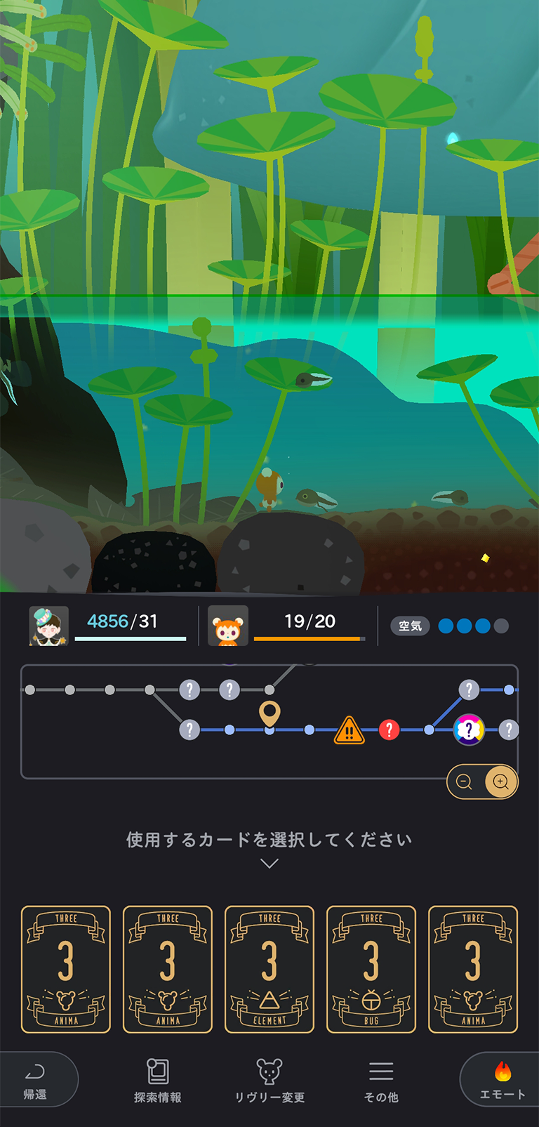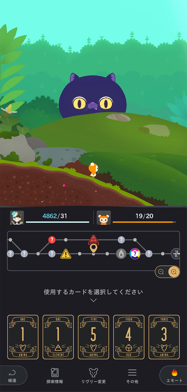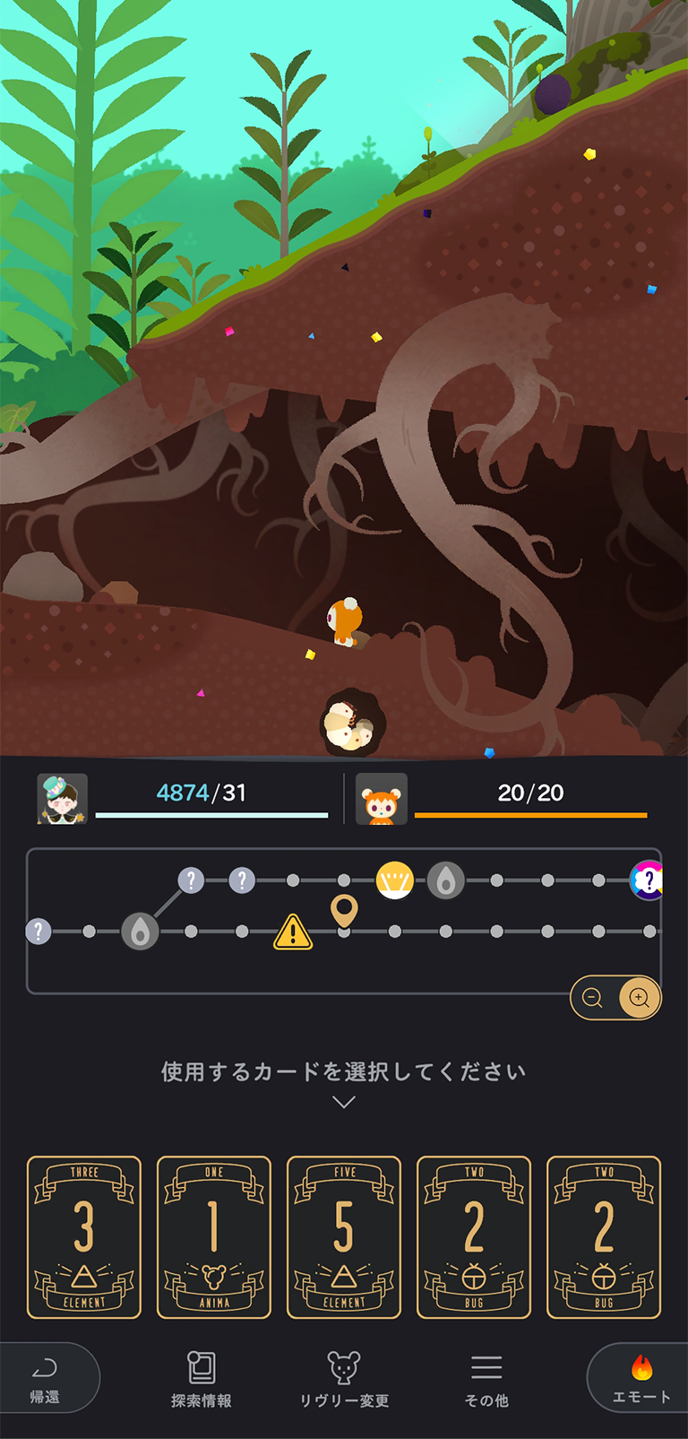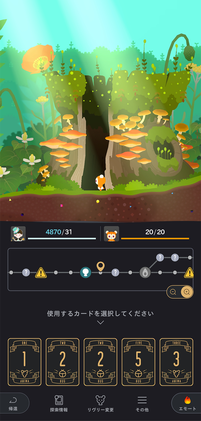 ボードゲームのような操作方法で、あなたのペースでマスを移動し、のんびり自然を楽しみながらのお散歩をするも良し、リヴリーのエサとなる虫や錬金術の素材をどんどん収集するも良し、自由なスタイルをお選びいただけます。