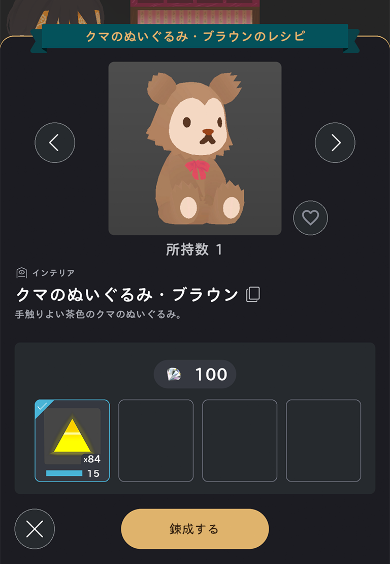 集めた素材を組み合わせることで、服や家具などのアイテムを錬成できます。